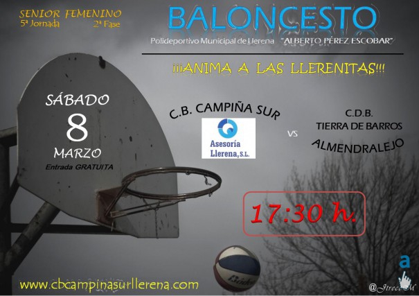 El sábado por la tarde, el sénior femenino ASESORÍA LLERENA C.B. CAMPIÑA SUR, jugamos frente a C.D.B. Tierra de Barros a las 17:30 hs. en el "ALBERTO PÉREZ", el último partido de la segunda fase. Las "llerenitas", con el liderato del grupo de Badajoz y con la clasificación para la tercera fase asegurados, intentaremos cerrar con victoria esta fase.