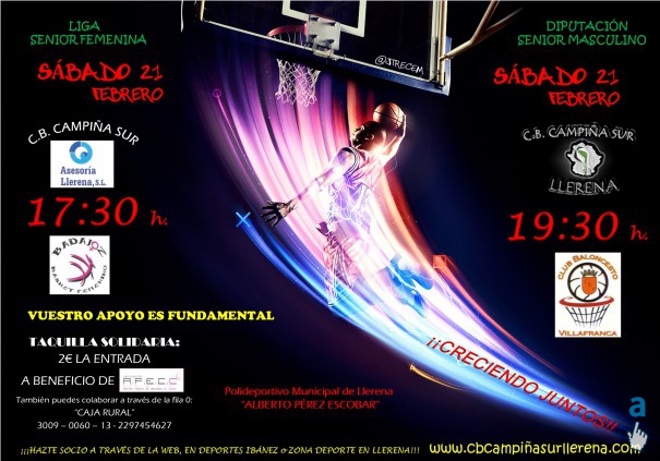 ASESORÍA LLERENA C.B. CAMPIÑA SUR - BADAJOZ BÁSKET FEMENINO. En este partido se llevará a cabo la TAQUILLA SOLIDARIA, entrada 2 €. El dinero que se recaude con la venta de las entradas, irá a beneficio de A.F.E.C.C.. También se podrá colaborar con esta asociación a través de la FILA 0, haciendo donación en la cuenta: