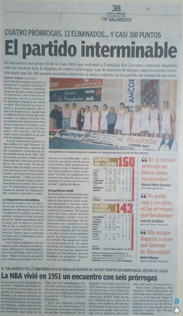 Del lunes 4 al viernes 8 de julio de 2022, se desarrolla el tradicional CAMPUS DE BALONCESTO "ALBERTO PÉREZ", en la que será ya su VIGÉSIMO PRIMERA EDICIÓN. En él, se entrega el PREMIO "ALBERTO PÉREZ" A LA PERSONA O INSTITUCIÓN POR LA REPRESENTACIÓN EN LOS VALORES DEL DEPORTE. Tenemos la satisfacción de comunicar que , en la edición número 11, el premio ha recaído en los componentes de la DIRECTIVA Y EN LOS JUGADORES MÁS REPRESENTATIVOS DE LA TEMPORADA 2001/2002. Hace veintiuna temperadas que se consiguió el ascenso a la LIGA EBA (para situarnos un poco y darle el valor que merece, aclaro que equivale a la 2ª B de la época en competición de fútbol). Algo histórico, que ya en tiempo creemos que no se le dio el valor y la importancia que merece, y que hoy en día aún debemos darle. Pues bien, hace 20 años, en partido de competición de la LIGA EBA, en el PABELLÓN MUNICIPAL DE LLERENA, que hoy día lleva el nombre de nuestro queridísimo ALBERTO PÉRE ESCOBAR (entonces gran entrenador del equipo), se consiguió un RÉCORD HISTÓRICO DE TANTEO EN COMPETICIONES NACIONALES DE BALONCESTO EN ESPAÑA, que 20 años después, está vigente. Partido que se resolvió a la heroica, con cuatro prórrogas y con tan solo dos jugadores de los nuestros en pista. “El tope de puntos anotados en competiciones FEB los tiene un partido para enmarcar, un encuentro de liga EBA de la temporada 2001/02, jugado por el Campiña Sur Llerena y el CB Marbella que terminó 150-143”. Destacar nombres de la directiva de la época y jugadores: Antonio Ríos (presidente), Carlos Ponce, Pedro Rex y Javi Molina, la directiva. José Ríos, Antonio Sevillano, Fernando Tablas, Juanjo Hernández y Javier Juan Lobato, entre otros, como jugadores. La cantera tuvo su protagonismo con uno que no se lo quiso perder, Juan Carlos Seijo. Y destacar al entrenador, ALBERTO PÉREZ ESCOBAR.
