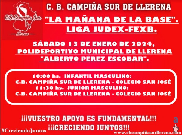 El próximo fin de semana vuelve la competición, vuelve la liga regular JUDEX-FEXB para nuestros equipos de la BASE que compiten. Los equipos INFANTIL y CADETE FEMENINOS, jugarán la mañana del sábado 13 de enero de 2024 en la pista de C.B.A. BURGUILLOS. Los equipos INFANTIL y JÚNIOR MASCULINOS, jugarán el sábado "LA MAÑANA DE LA BASE" en el Polideportivo Municipal de Llerena "ALBERTO PÉREZ".  ¡¡¡OS ESPERAMOS!!!