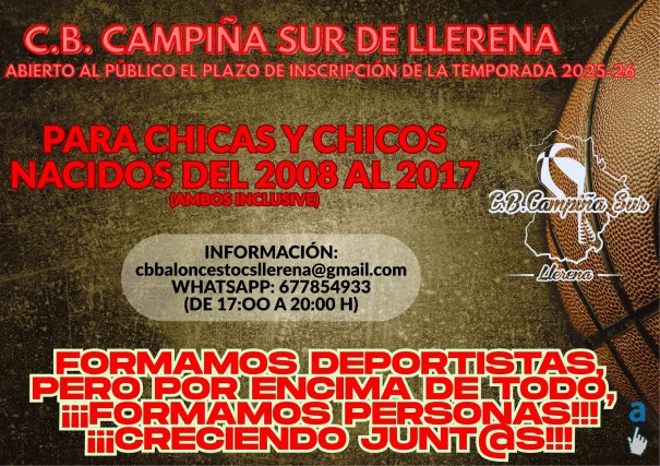 El BALONCESTO LLERENENSE comienza una nueva temporada. Contaremos con los equipos de la ESCUELA DE BALONCESTO BENJAMÍN, ALEVÍN, INFANITL, CADETES Y JUNIORS (categorías femenina y masculina).