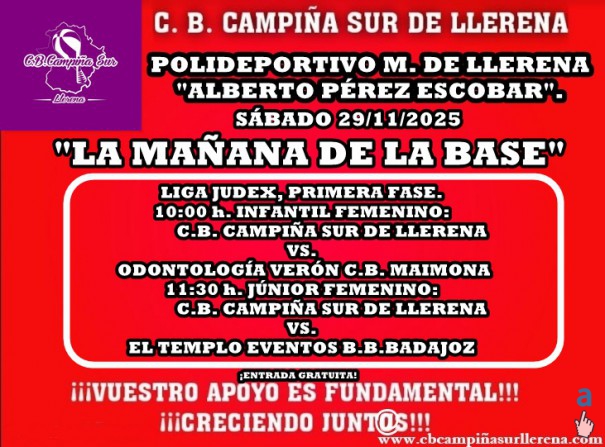 El próximo fin de semana, séptima jornada de la temporada para nuestros equipos de la BASE, en JUDEX-FEXB. Nuestros equipos MASCULINOS INFANTIL Y CADETE, jugarán la mañana del sábado 29 de noviembre de 2025 en la pista de C.P. BOSCO de MÉRIDA. Nuestros equipos FEMENINOS INFANTIL y JÚNIOR, juegan  "LA MAÑANA DE LA BASE" el SÁBADO 29 DE NOVIEMBRE DE 2025 en el "ALBERTO PÉREZ".